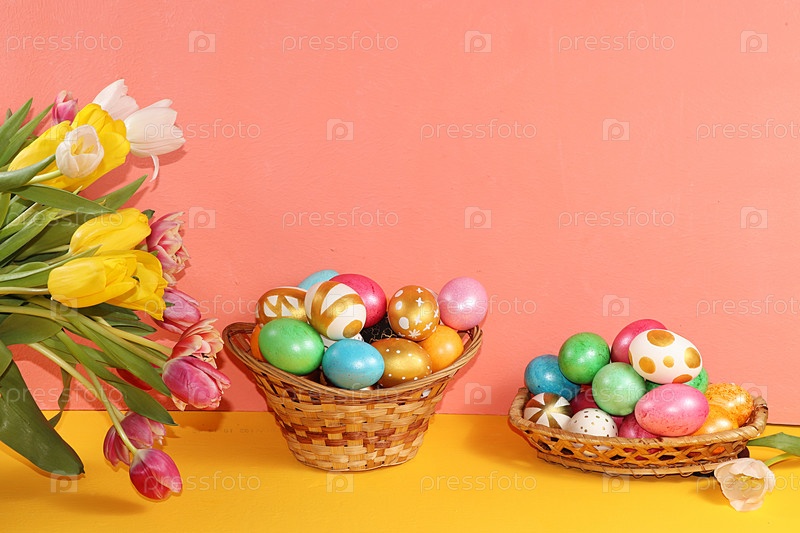 Украшенные золотые пасхальные яйца на модном розовом фоне. Минимальная концепция праздника. Счастливый пасхальный фон, место для текста, открытка, баннер для экрана