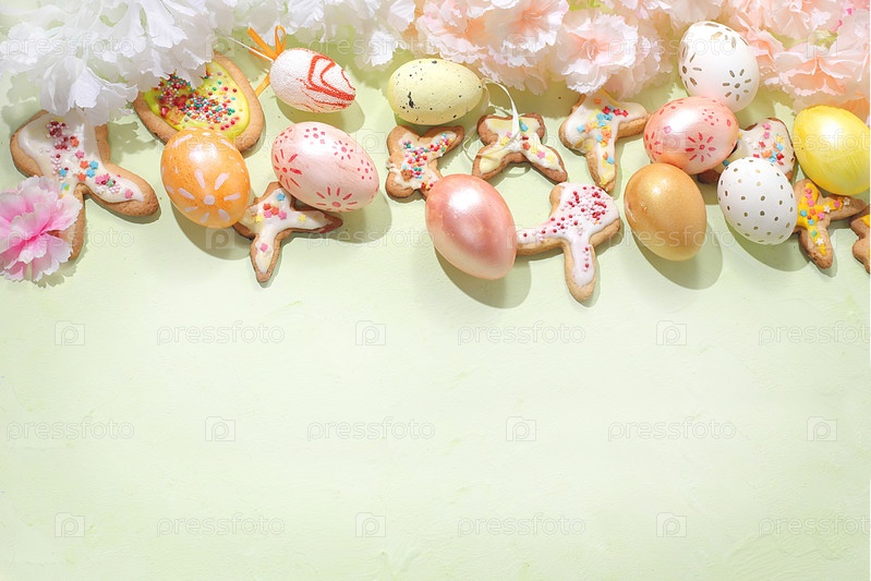 Концепция счастливой Пасхи, весенняя открытка, композиция с цветами, печеньем и яйцами на нежном фоне. Праздничная минимальная концепция, идеи домашней выпечки, место для текста, баннер для экрана, выборочный фокус
