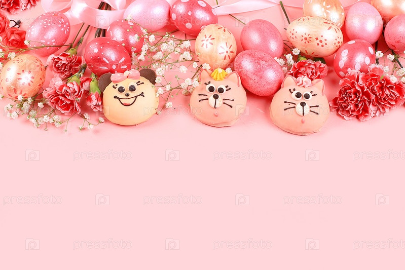 Концепция счастливой Пасхи, поздравительная открытка, фон. Украшенные розовые пасхальные яйца на нежном фоне. Праздничная минимальная концепция. Весенняя композиция с гвоздиками и сладостями, место для текста, баннер для экрана