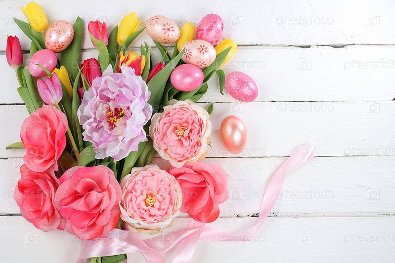 Концепция счастливой Пасхи, весенняя открытка, композиция с цветами и яйцами на нежном фоне. Праздничная минимальная концепция, место для текста, баннер для экрана, выборочный фокус