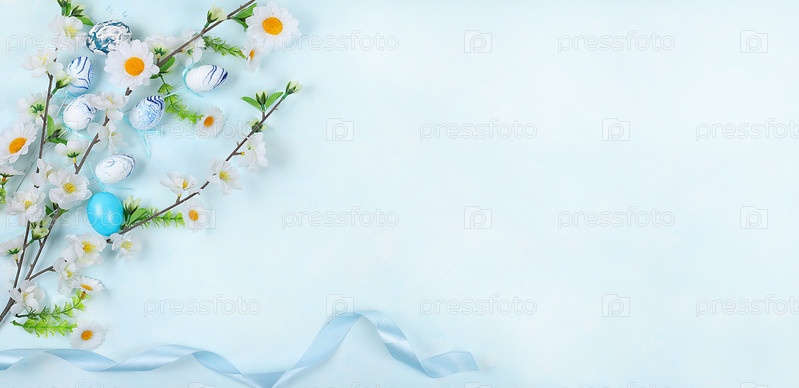 Концепция счастливой Пасхи, весенняя открытка, фон. Украшенные синие пасхальные яйца на нежном фоне. Минимальная праздничная концепция, место для текста, баннер для экрана, шаблон для дизайна, выборочный фокус