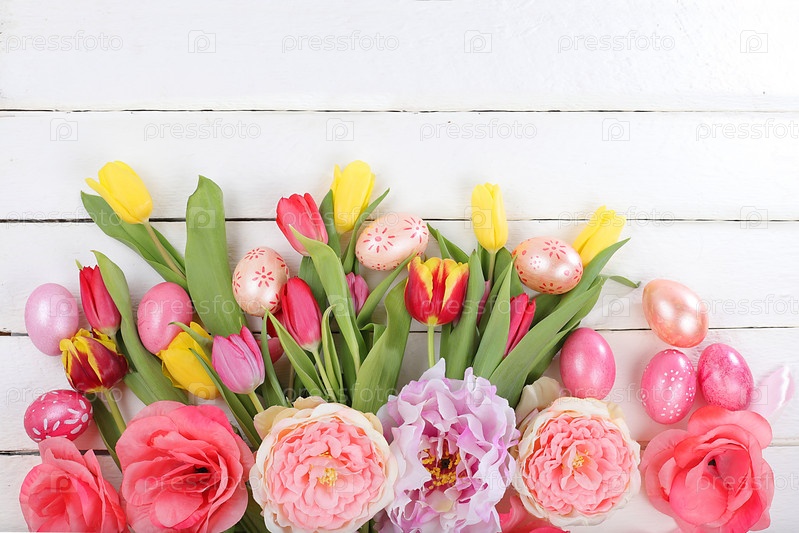 Концепция счастливой Пасхи, весенняя открытка, композиция с цветами и яйцами на нежном фоне. Праздничная минимальная концепция, место для текста, баннер для экрана, выборочный фокус