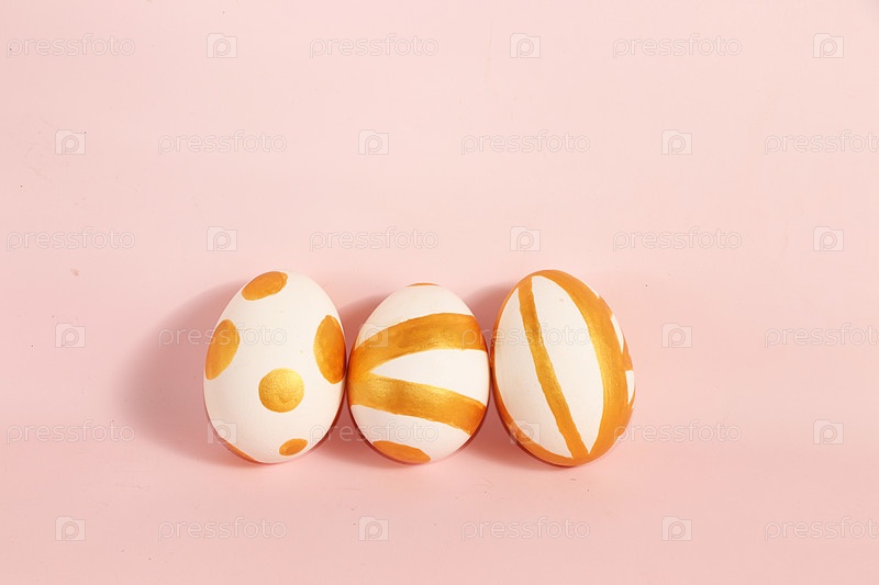 Украшенные золотые пасхальные яйца на розовом фоне. Минимальная концепция праздника. Счастливый пасхальный фон. Креативная роспись яиц в домашних условиях, идеи простых рисунков для раскрашивания