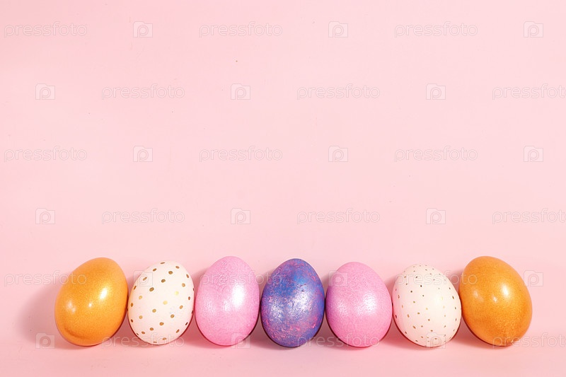 Украшенные золотые пасхальные яйца на розовом фоне. Минимальная концепция праздника. Счастливый пасхальный фон. Креативная роспись яиц в домашних условиях, идеи простых рисунков для раскрашивания
