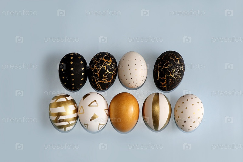 Концепция счастливой Пасхи, весенняя открытка, фон. Украшенные золотые пасхальные яйца на сером фоне. Минимальная праздничная концепция, место для текста, баннер для экрана, шаблон для дизайна, выборочный фокус