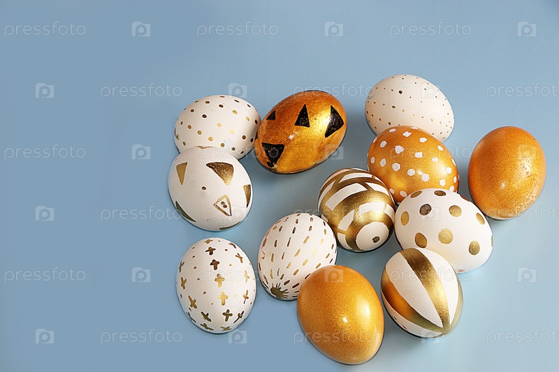 Концепция счастливой Пасхи, весенняя открытка, фон. Украшенные золотые пасхальные яйца на сером фоне. Минимальная праздничная концепция, место для текста, баннер для экрана, шаблон для дизайна, выборочный фокус