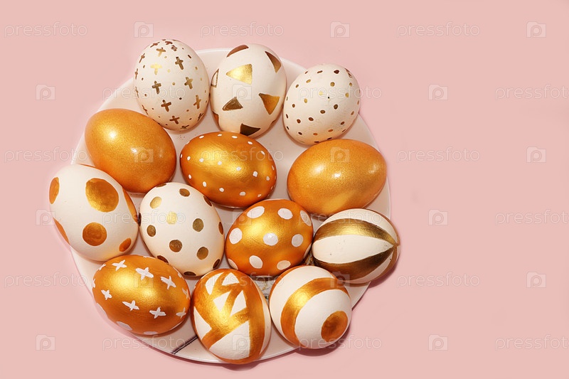 Украшенные золотые пасхальные яйца на розовом фоне. Минимальная концепция праздника. Счастливый пасхальный фон. Креативная роспись яиц в домашних условиях