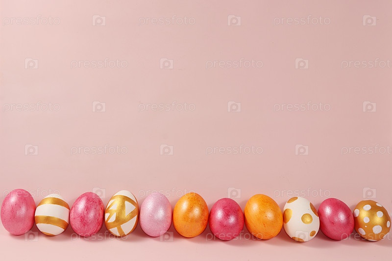 Украшенные золотые пасхальные яйца на розовом фоне. Минимальная концепция праздника. Счастливый пасхальный фон. Креативная роспись яиц в домашних условиях, идеи простых рисунков для раскрашивания