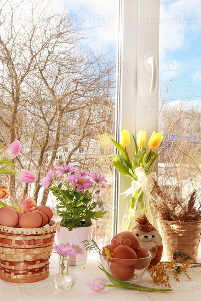 Праздничное пасхальное знамя, весенняя композиция с украшенными домашними яйцами и цветущими цветами, пасхальная творческая концепция, идеи украшения дома, шаблон экрана, выборочный фокус