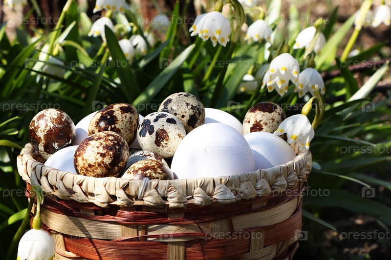 Декоративная корзина с красочными пасхальными яйцами в траве на фоне подснежников. Подготовка и атмосфера праздника Пасхи в весеннем саду