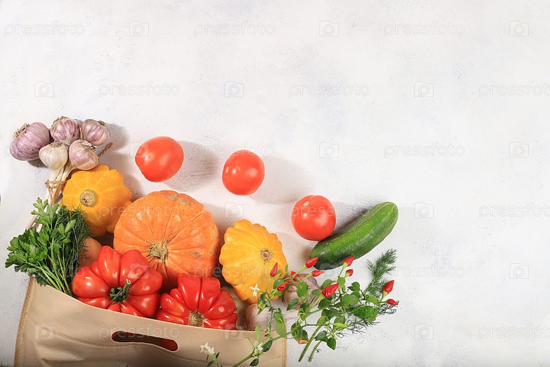 Здоровая натуральная пища в эко-сумке, концепция здорового образа жизни, ноль отходов. Доставка еды, пожертвование, карантин от коронавируса. Овощи, фрукты и зелень в тканевой упаковке, вегетарианская диета, селективный фокус