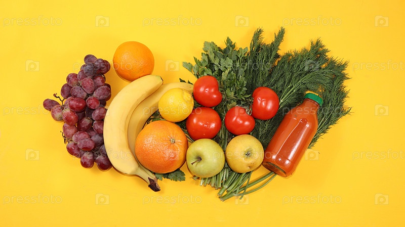 Здоровая органическая пища на желтом столе, концепция здорового образа жизни. Овощи, фрукты, виноград, травы, бананы, цитрусовые, диетические ингредиенты, плоская планировка, место для текста