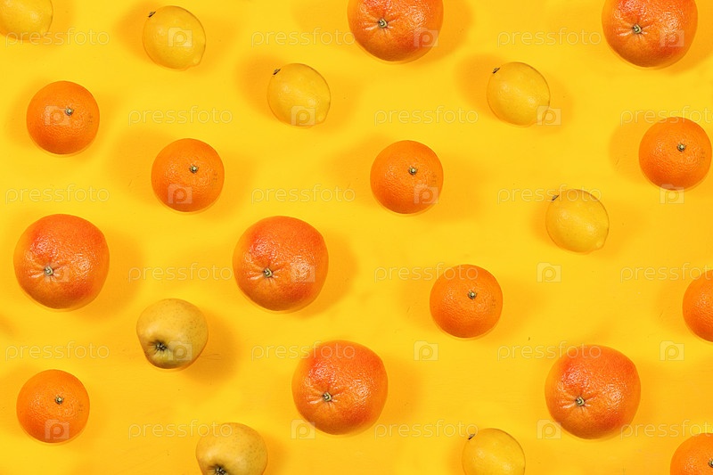 Здоровая органическая пища на желтом столе. Летний баннер, цитрусовые, грейпфрут, апельсин, лимон на ярко-желтом фоне, минимальная концепция релаксации и детоксикации, диета и потеря веса. узор, плоская планировка. Источник витамина С