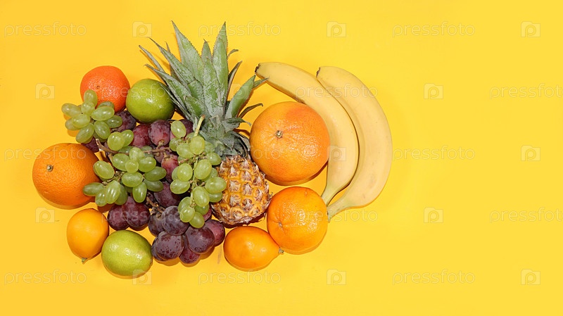 Тропические фрукты, грейпфрут, апельсин, лимон на желтом фоне, здоровая пища, летний баннер. Концепция минимальной релаксации. Место для текста, плоская планировка. Концепция здоровой и натуральной пищи. Витамины С