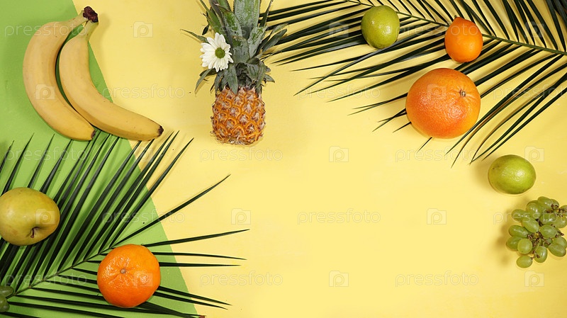 Тропические фрукты, грейпфрут, апельсин, лимон на желтом фоне, здоровая пища, летний баннер. Концепция минимальной релаксации. Место для текста, плоская планировка. Концепция здоровой и натуральной пищи. Витамины С