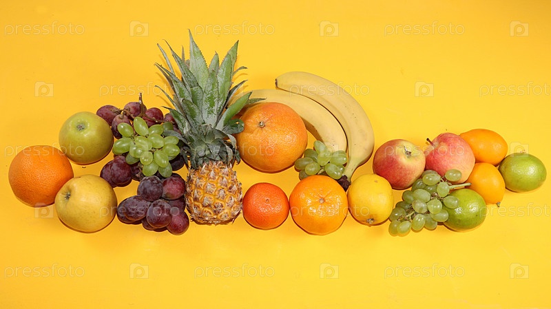 Тропические фрукты, грейпфрут, апельсин, лимон на желтом фоне, здоровая пища, летний баннер. Концепция минимальной релаксации. Место для текста, плоская планировка. Концепция здоровой и натуральной пищи. Витамины С