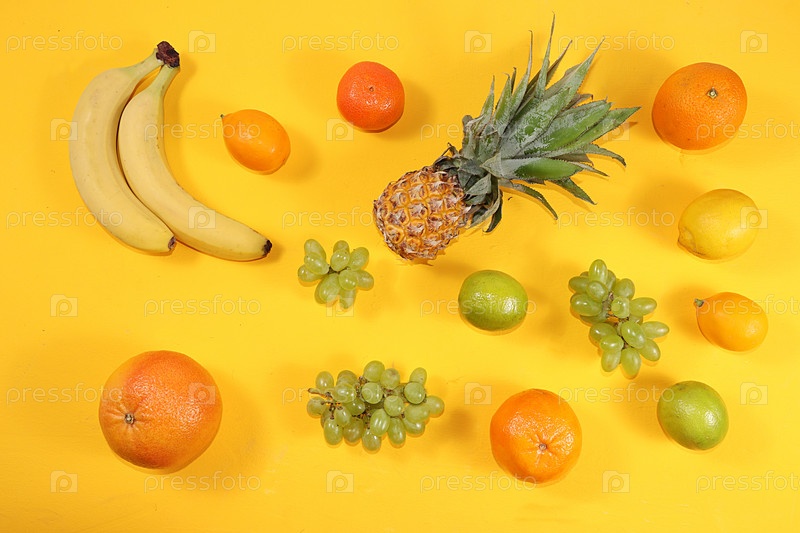 Тропические фрукты, грейпфрут, апельсин, лимон на желтом фоне, здоровая пища, летний баннер. Концепция минимальной релаксации. Место для текста, плоская планировка. Концепция здоровой и натуральной пищи. Витамины С