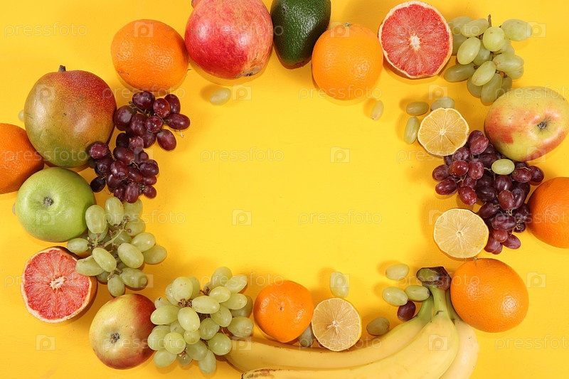 Тропические фрукты, грейпфрут, апельсин, лимон на желтом фоне, здоровая пища, летний баннер. Концепция минимальной релаксации. Место для текста, плоская планировка. Концепция здоровой и натуральной пищи. Витамины С