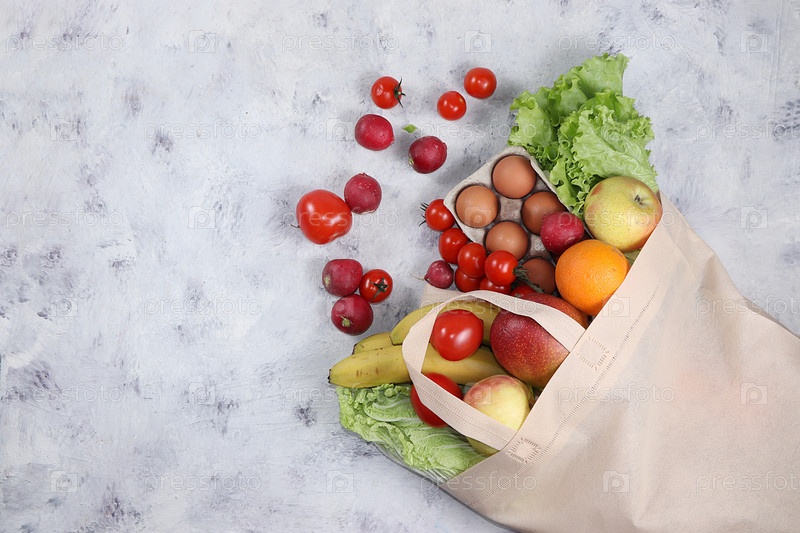 Здоровые натуральные продукты в эко-сумке для повышения иммунитета, концепция здорового образа жизни, ноль отходов. Овощи, фрукты в тканевой упаковке, диетические. Баннер для магазина. Без пластика