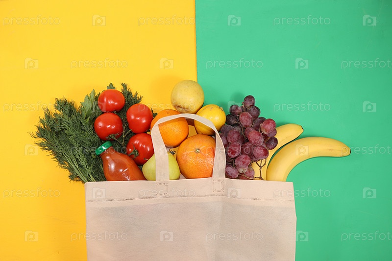 Здоровые натуральные продукты в эко-сумке на ярком фоне, концепция здорового образа жизни и похудения, ноль отходов. Овощи, фрукты в тканевой упаковке, диетические. Баннер для магазина. Без пластика