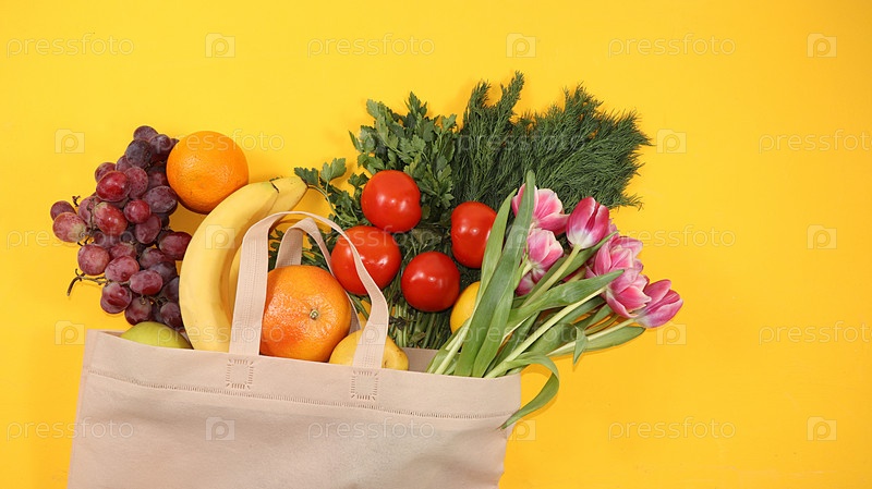 Здоровые натуральные продукты в эко-сумке на ярком фоне, концепция здорового образа жизни и похудения, ноль отходов. Овощи, фрукты в тканевой упаковке, диетические. Баннер для магазина. Без пластика