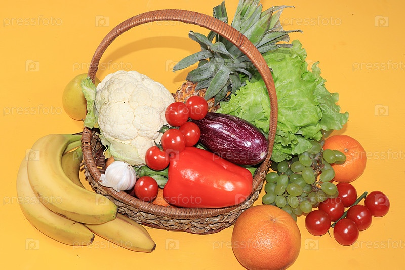 Овощи, фрукты в корзине. Концепция здоровых и натуральных продуктов для повышения иммунитета, здорового образа жизни и похудения, витаминов. Летний баннер для экрана