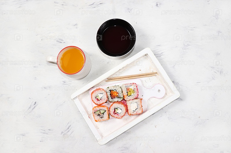 Свежие суши-роллы с соусом на светлом фоне, традиционная японская кухня, место для текста, вид сверху, баннер для рекламы магазина или приглашения, выборочный фокус