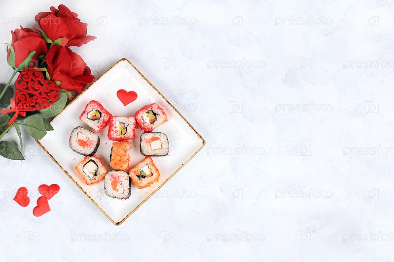 Сердце из свежих суши-роллов с розами, еда на день святого валентина, традиционная японская кухня, место для текста, вид сверху, баннер для рекламы магазина или приглашения, выборочный фокус