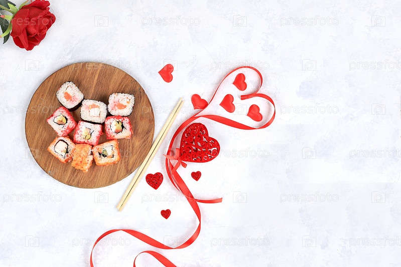 Сердце из свежих суши-роллов с розами, еда на день святого валентина, традиционная японская кухня, место для текста, вид сверху, баннер для рекламы магазина или приглашения, выборочный фокус