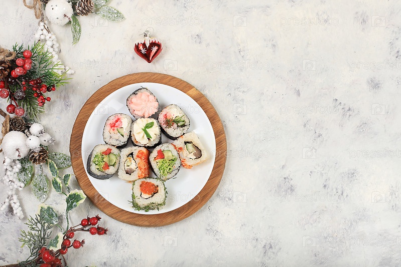 Елочка из свежих суши-роллов с соусом на светлом фоне с праздничными украшениями, рождественская новогодняя еда, традиционная японская кухня, место для текста, вид сверху, баннер для рекламы магазина или приглашение, выборочный фокус