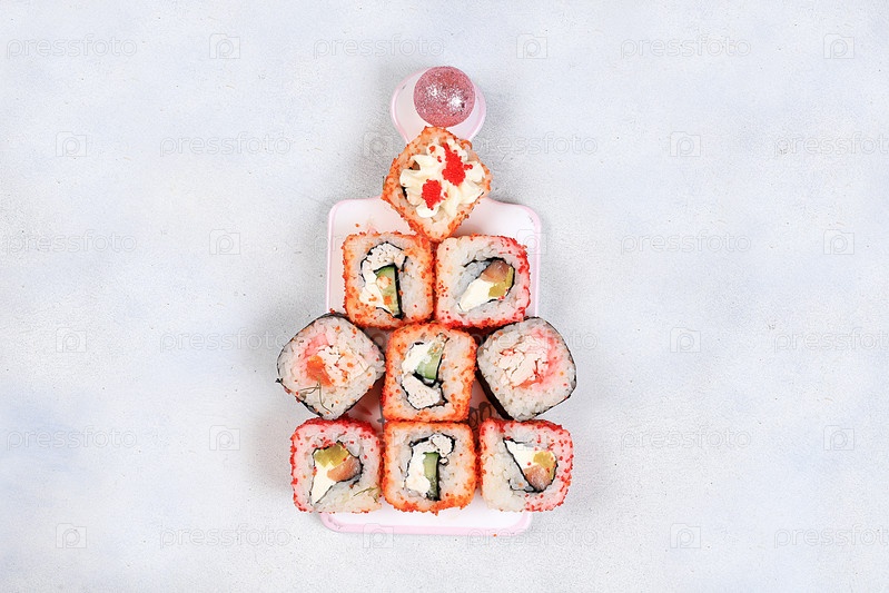 Елочка из свежих суши-роллов с соусом на свету, рождественская новогодняя еда, традиционная японская кухня, место для текста, вид сверху, баннер для рекламы магазина или приглашения, выборочный фокус