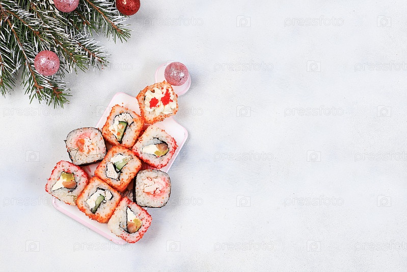Елочка из свежих суши-роллов с соусом на свету, рождественская новогодняя еда, традиционная японская кухня, место для текста, вид сверху, баннер для рекламы магазина или приглашения, выборочный фокус