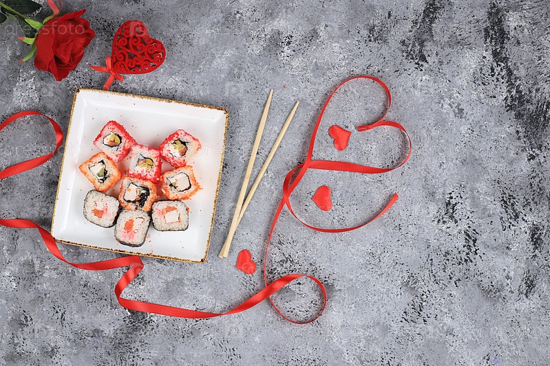 Сердце из свежих суши-роллов с розами, еда на день святого валентина, традиционная японская кухня, место для текста, вид сверху, баннер для рекламы магазина или приглашения, выборочный фокус