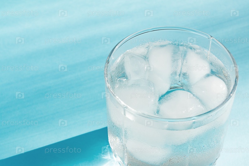 Крупный план чистой воды со льдом в прозрачном стекле и солнечными бликами на синем фоне