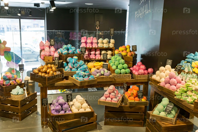 МОСКВА, РОССИЯ - 24 апреля 2018 г.: Магазин косметики в Москве. Свежая косметика ручной работы с красочной пеной для ванны и бомбочками