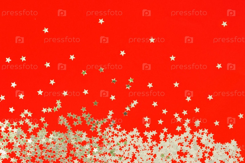 Красный фон с блестками и серебряными звездами конфетти. Праздничный праздник яркий фон