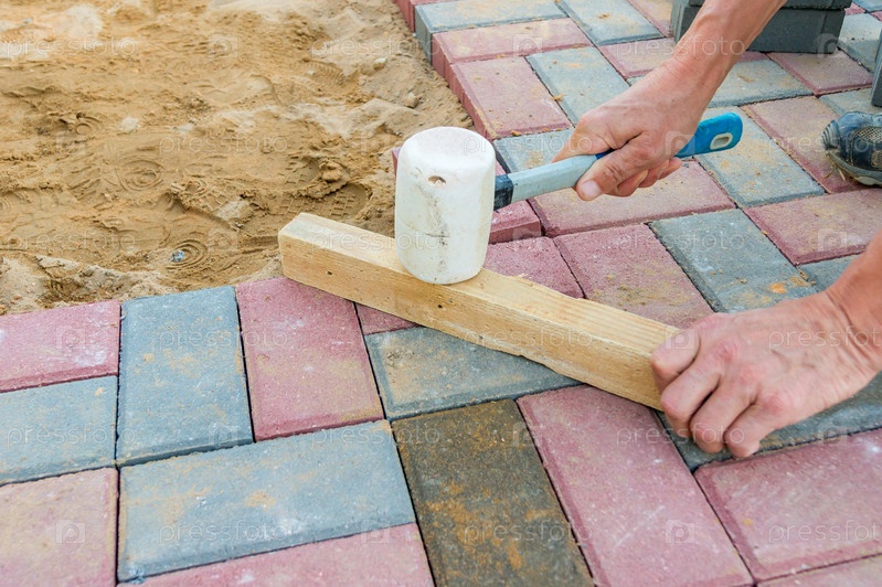 Рабочий укладывает красную и серую бетонную брусчатку. Мощение дорог, строительство