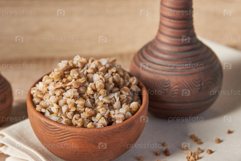 Крупный план чаши с приготовленной гречневой кашей на текстильном фоне