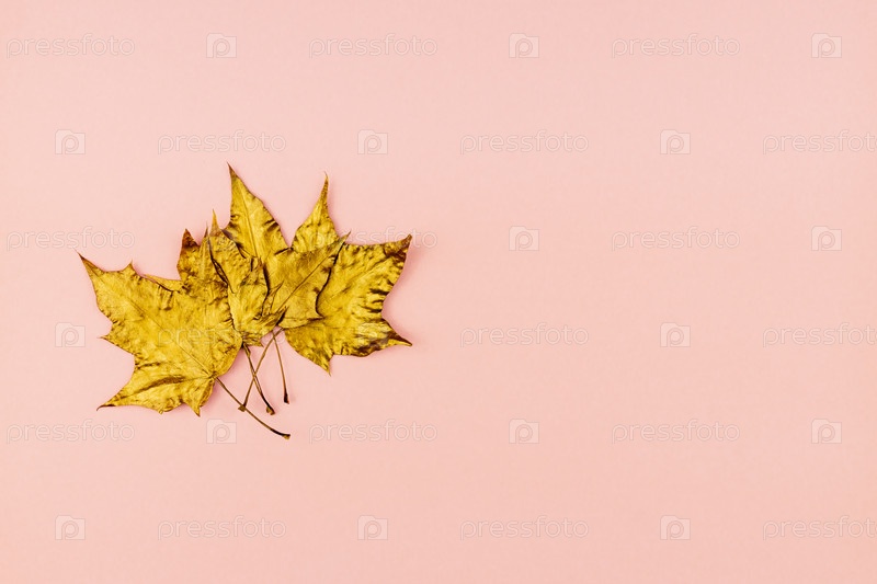 Осенний букет из золотых окрашенных кленовых листьев на розовом фоне. Модная концепция. Flay лежал в стиле минимализма