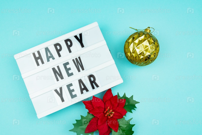 Световой короб с новым годом с золотой безделушкой и пуансеттией на синем фоне