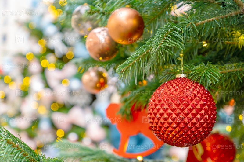 Закройте украшение елки игрушками и гирляндами. Праздничная открытка к зимним праздникам