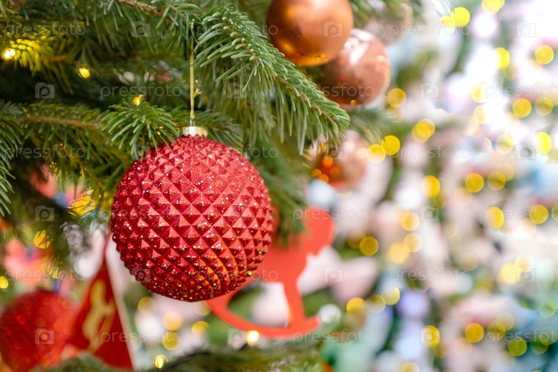Закройте украшение елки игрушками и гирляндами. Праздничная открытка к зимним праздникам