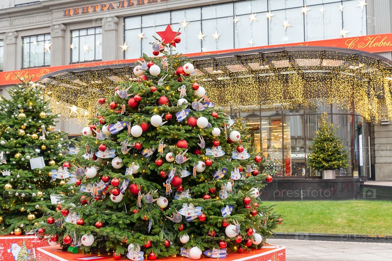 Москва, Россия - 18 декабря 2019 г.: Праздничное праздничное оформление Универсального ЦУМа. Красный бант на фасаде