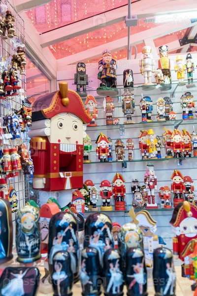 МОСКВА, РОССИЯ - 18 декабря 2019 г.: Набор рождественских деревянных щелкунчиков на полке. традиционный рождественский базар