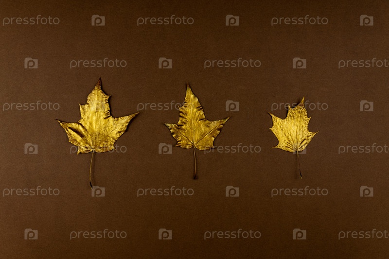 Три золотой окрашенных кленовых листья на тёмно-коричневом фоне. модная концепция. Flay лежал в стиле минимализма