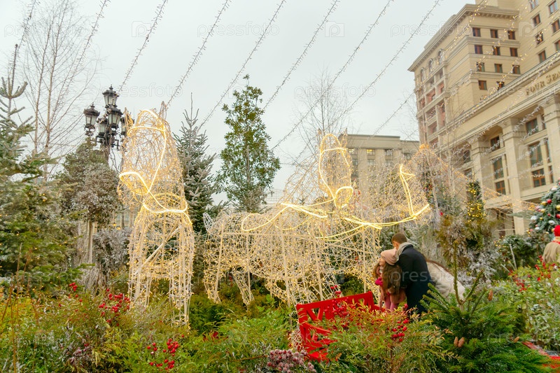 Москва, Россия - 18 декабря 2019 г.: на Манежной площади шли легкие лошади. Праздничное рождественское уличное украшение