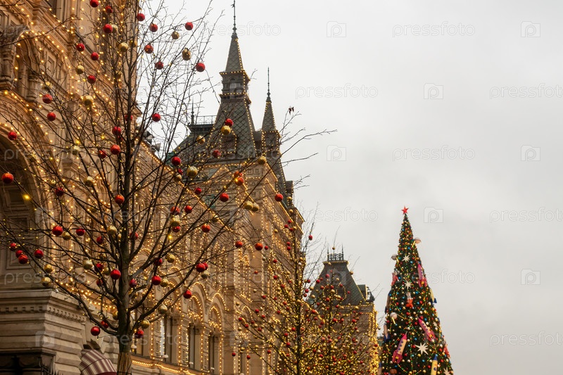 МОСКВА, РОССИЯ - 18 декабря 2019 г.: Вид на праздничный торговый центр ГУМ в рождественские праздники. Ряд деревьев украшен красными и золотыми шарами