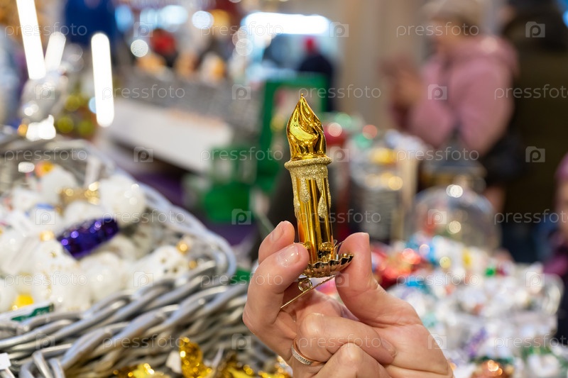 Женская рука держит в магазине игрушечную свечу, рождественское украшение. Подготовка к праздникам
