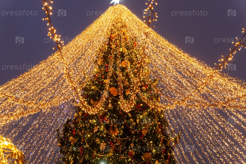 Украшение елки безделушками и гирляндой. Праздничная открытка к зимним праздникам