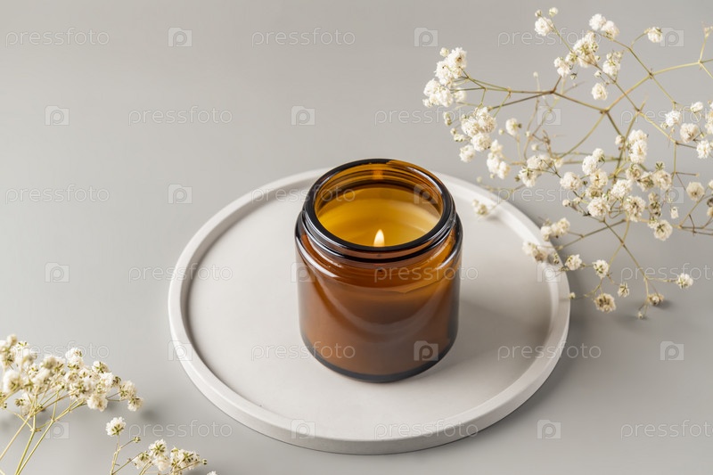 Свеча ручной работы из парафина и соевого воска в стеклянной банке на бетонном подносе. Изготовление свечей. Минимализм. Роскошное украшение белого подноса, домашний декор с горящей ароматической свечой с белым сухим цветком